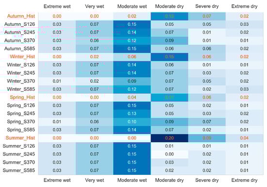 The heatmap of mean occurrence frequency for different drought levels at the seasonal scale in the historical (1961–2014) and future periods (2015–2100) under four emission scenarios (i.e., SSP126, SSP245, SSP370 and SSP585). The labels in the vertical axis represent the combination of season and period or scenario; for example, ‘Autumn_Hist’ means that the statistics belong to the autumn of the historical period. Moreover, for better comparison and understanding, all results in the historical period are marked orange.
