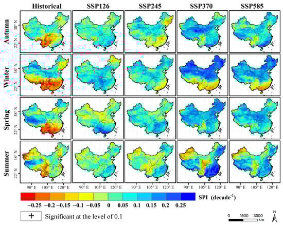 Spatial distribution of interannual variations of standard precipitation index (SPI) at the seasonal scale during historical (1961–2014) and historical plus future periods (1961–2100) under four emission scenarios, such as ‘Historical + SSP126′. Four emission scenarios included in future periods are SSP126, SSP245, SSP370, and SSP585, respectively. Moreover, the shadow areas marked with the symbol ‘+’ indicated that the variations of SPI were significant at the level of 0.05.