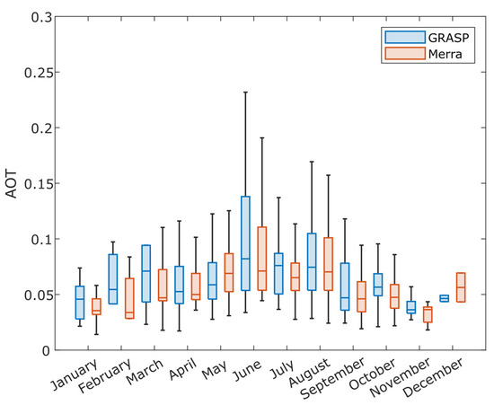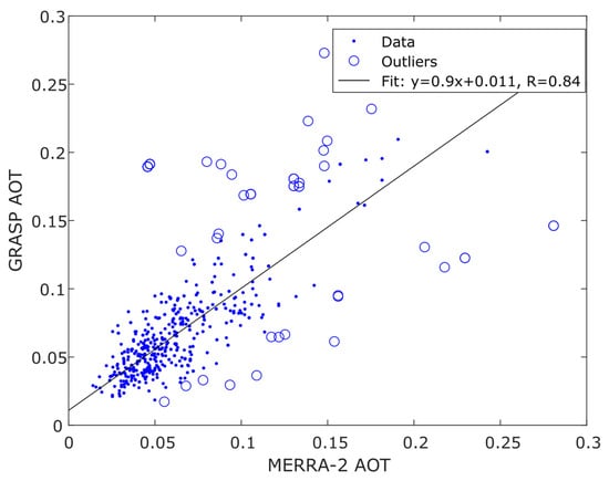 We conducted a comparison between the AOT values derived from the MERRA2 dataset and those obtained through GRASP (Figure 1). Data for the nearest grid point to the station location were chosen as representative of the studied location. We used GRASP and coincident MERRA-2 data only for cases when layers were manually recognized. Moreover, it is worth noting that the time between measured (GRASP) and modeled (MERRA-2) values may be up to 1.5 h, as MERRA-2 data are available in 3-h intervals.