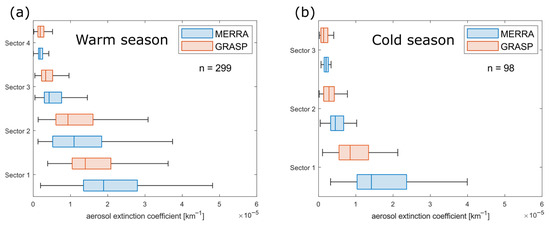 In addition, Wilcoxon analysis of MERRA2 vs. GRASP for each sector was performed for both the cold and warm parts of the year. Sample populations and the related median values differ significantly for most cases except Sectors 2 and 4 during the warm part of the year. This result is not surprising and confirms the difference between median values visible in Figure 4 and bias within sectors between the mean profiles visible in Figure 2 and Figure 3.