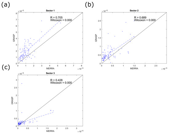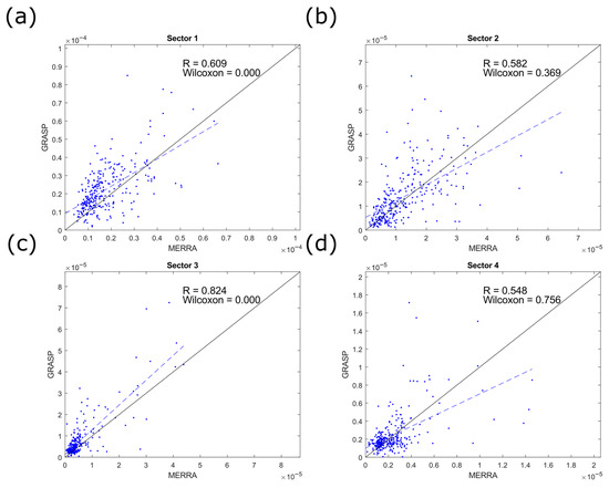 While a positive result of the Wilcoxon T-test indicates statistical differences between the populations, it does not provide information on the correlation between individual data points. In principle, a bias may be present between the data sets that will influence the medians and averages of the populations but not the correlations between the individual values. To analyze the co-behavior of GRASP and MERRA2 in the corresponding sectors, we prepared scatter plots for each pair of sectors, fitted straight lines to identify potential biases, and calculated correlation coefficients (R) for the population pairs. The results for warm and cold seasons are given in Figure 5 and Figure 6, respectively, along with the calculated values of the Pearson coefficient.