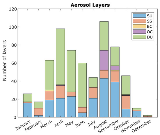 Our analysis, depicted in Figure 8, reveals two prominent peaks in the number of identified layers, occurring in April and August. However, it is important to note that the high number of layers observed in April does not correspond to high AOT values, as depicted in Figure 7. This observation suggests that most layers identified in April are optically thin.