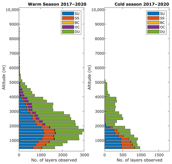 Vertical distribution of the number of dominant aerosol species per 15 m layers observed for 2017–2020 with a bin size of 200.