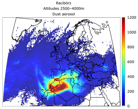Model spatial resolution is 0.5° × 0.625° latitude by longitude and 72 hybrid levels from ground to 0.01 hPa. Values for grid points closest to Raciborz were used to calculate vertical profiles of aerosol optical properties for each aerosol type. We used the inst3_3d_aer_Nv data collection [66] MERRA-2 product for aerosol mixing ratio and the inst3_3d_asm_Np data collection [67] MERRA-2 product for relative humidity and layer height values. We used Mie scattering theory for spherical parties [68] and non-sphericity for dust according to [64] to calculate aerosol extinction from mixing ratios and aerosol properties used in MERRA-2 reanalysis. Aerosol properties calculated for model layer heights, which are irregular according to surface pressure, were interpolated on regular altitude vectors. Calculated extinctions of each aerosol type were integrated for each aerosol layer (see Section 2.3) to obtain the optical thickness of the detected layer related to each aerosol type. The aerosol of maximum thickness for the specific layer was considered to be the dominant type for this specific layer.