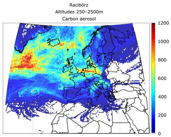 The Racibórz station (50.08° N, 18.19° E) is part of the observation network maintained by the Institute of Geophysics, Polish Academy of Sciences, and the primary site for this study. It is located in southern Poland and is surrounded by the Sudeten and Carpathian Mountains on either side. Since it is situated in a depression between the two mountain ranges, it is very susceptible to the flow of polluted air from the Ostrava industrial zone in the Czech Republic and also from the highly urbanized and industrialized region of Silesia in Poland. Long-range aerosol transport is often observed at this site [13,39]. The sources of aerosol advection to this region are identified to be biomass-burning aerosols from the Belarusian–Ukrainian border, urban/industrial aerosols from Slovakia and northern Hungary, continental aerosols from western Poland and eastern Germany, and maritime aerosols from the Baltic and North Atlantic seas [16,40]. Therefore, the station is at a hotspot of high aerosol loading for the region, as shown by [16,41].