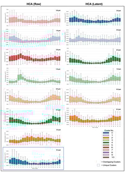 Temporal profiles exhibiting the average recorded particle concentrations (cm3) for each hour of the day for both HCA approaches. The left column corresponds to HCA (raw), whilst the right column denotes HCA (latent). The average size of each cluster is presented in microns on each profile. The number of clusters for each method correspond to the optimal number of clusters identified by that method. Overlapping clusters are grouped with red parentheses. Unique clusters, which represent clusters that were only identified by the respective method, are grouped into blue boxes.