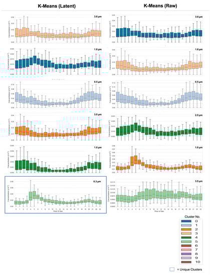 Temporal profiles exhibiting the average recorded particle concentrations (cm3) for each hour of the day for both K-means approaches. The left column corresponds to K-means (latent), whilst the right column denotes K-means (raw). The average size of each cluster is presented in microns on each profile. The number of clusters for each method correspond to the optimal number of clusters identified by that method. Unique clusters, which represent clusters that were only identified by the respective method, are grouped into blue boxes.