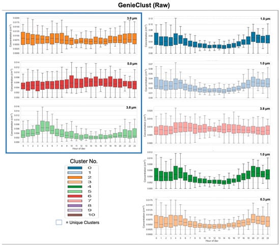 GenieClust (Raw) temporal profiles exhibiting the average recorded particle concentrations (cm3) for each hour of the day. The average size of each cluster is presented in microns on each profile. Number of clusters correspond to the optimal number of clusters identified. Unique clusters, which represent clusters that were only identified by the respective method, are grouped into blue boxes.