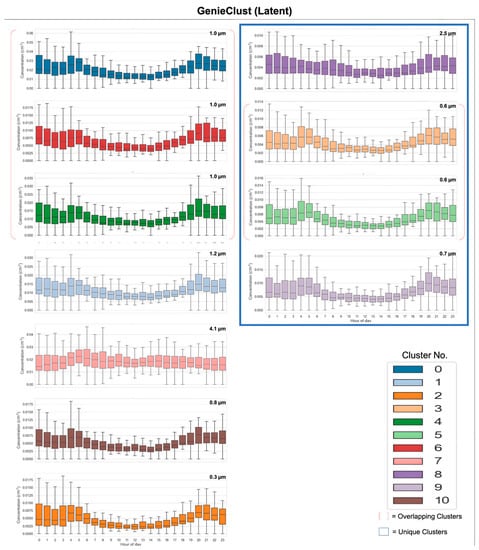 GenieClust (latent) temporal profiles exhibiting the average recorded particle concentrations (cm3) for each hour of the day. The average size of each cluster is presented in microns on each profile. Number of clusters correspond to the optimal number of clusters identified. Overlapping clusters are grouped with red parentheses. Unique clusters, which represent clusters that were only identified by the respective method, are grouped into blue boxes.