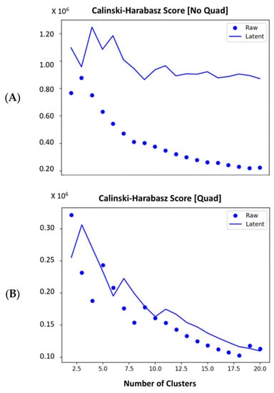 The relationship between the Calinski–Harabasz score value and number of clusters is illustrated in Figure 6. As can be observed from Figure 6A, the raw clustered data peak at three clusters before sharply dropping by several orders of magnitude to a potential peak between cluster 8 and 9. Conversely, the latent dataset appears to show prominent peaks at clusters 3, 6, and 11 before plateauing with a maintained high score, relative to the raw value. Figure 6B displays three peaks for both the raw and latent data at clusters 2, 5, and 8.5/9 and 3, 7.5, and 11, respectively. Upon assessing the CH-Score, there is an evident increase in the quality of the clusters when encoding the data to a latent vector, as is demonstrated by the consistently higher scores exhibited in Figure 6A,B. Observably, the raw and latent data share an inverse relationship to one another for reasons not entirely clear. However, it should be noted that in almost all cases, the troughs displayed by the latent data retain a higher overall CH-Score than the peaks for the raw data, thereby inferring a greater degree of cluster separation regardless. Interestingly, despite the large decrease in the CH-Score in Figure 6B, a degree of similarity can be drawn from the optimal clusters observed for both latent outputs with clusters 3 and 11 being identified. From this we can surmise that the variance between outputs whether the quadrant information (QI) is included or not is relatively small and that the inclusion of it does not appear to provide better cluster separation. On the contrary, the inclusion of this information may contribute unnecessary ‘noise’. This can be further corroborated upon visualizing a time series of the methods side by side (Figure A4). Indeed, observing 11 clusters over the duration of the study for both latent outputs, it is clear that a higher degree of similarity between clusters is present when including the QI (Figure A4B) as opposed to without (Figure A4A), suggesting several overlapping clusters. In particular, clusters 0, 1, 3, 4, 5, 6, 9, and 10 (eight in total) are all visually similar, in contrast to the raw latent output, which exhibits half the number of similarities (clusters 3, 4, 5, and 6). The sizes of each cluster, as shown in Figure A5, demonstrate consistent agreement, exhibiting analogous sizes and distributions across all mentioned clusters. This is also the case when examining the compositional loadings (Figure A5), each of which is marked by a clear dominance of type B (60–80%) and type A (10–20%).