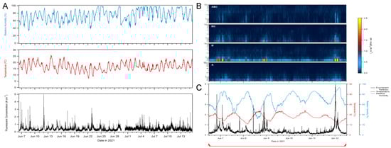 (A–C): (A) (Left)—Time series illustrating the fluorescent concentration throughout the duration of the study as well as the corresponding temperature and relative humidity at the supersite. (B) (Top Right)—Size distribution heatmap displaying particles by their category. (C) (Bottom Right)—FL conc. Time series (including meteorological conditions) for the first week of the study zoomed in.