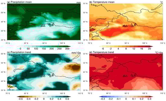 Gridded total annual precipitation (a) and mean annual temperature (b) from CRU TS4.06 in the study area for the period 1960–2021, with the corresponding linear trends (c,d). Triangles represent the locations of meteorological stations, the same below.