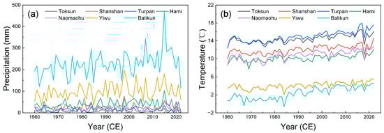 The total annual precipitation (a) and mean annual temperature (b) records of eastern Xinjiang during 1960–2022 from seven meteorological stations (Toksun, Shanshan, Turpan, Hami, Naomaohu, Yiwu, and Balikun).