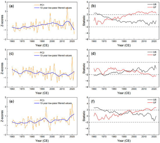 The variation (a) and sequential Mann–Kendall test (b) of PC1 for seven precipitation records from 1960 to 2022. (c,d) and (e,f) are both the same as (a,b) but for PC2 and PC3, respectively.