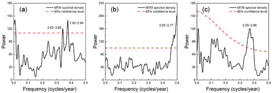 Principal cycles were calculated for PC1 (a), PC2 (b), and PC3 (c) using multi-taper spectral analysis method (MTM). The red dashed line indicates the 95% confidence level.