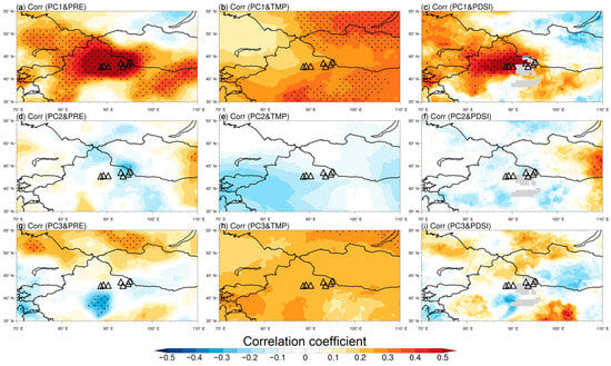 Spatial correlation patterns of PC1 with CRU gridded annual total precipitation (a), annual mean temperature (b), and annual mean scPDSI (c) since 1960. (d–f) as well as (g–i) are the same as (a–c) but for PC2 and PC3, respectively.