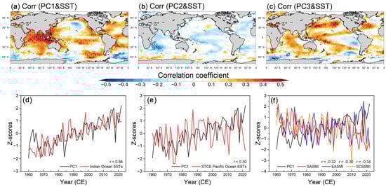 Spatial correlation patterns of PCs with HadISST1 SST data during 1960–2022 (a–c). Comparison of PC1 with the Indian Ocean SSTs (d), STCE SSTs (e), and Asian summer wind indices (ASWI) (f). Among them, the Asian summer wind index (ASWI) includes the South Asian summer wind index (SASWI), the East Asian summer wind index (EASWI), and the South China Sea summer wind index (SCSWI) (Li et al., 2010).