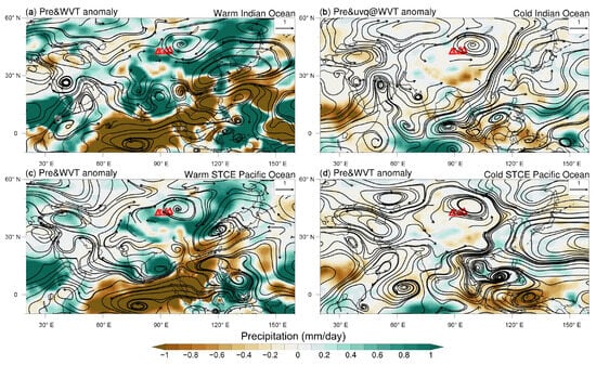 Spatial distribution of precipitation anomalies (shading, mm/day) and vertically integrated water vapor transport anomalies (vectors, where uq and vq are multiplied by 1000, kg/(m·s)) for years of warm Indian Ocean SSTs (a), cold Indian Ocean SSTs (b), warm STCE SSTs (c), and cold STCE SSTs (d), as extracted from NCEP/NCAR reanalysis data (1960–2022).