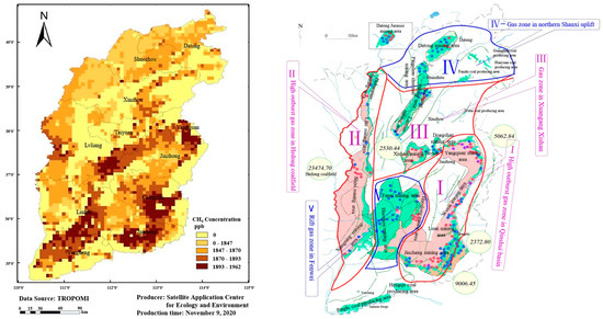 Shanxi Province has large coal reserves with wide distribution, but they are primarily concentrated in six coal fields: Datong, Ningwu, Hedong, Xishan, Huoxi, and Qinshui. There are also scattered coal-producing areas such as Hunyuan, Wutai, Fanzhi, Pinglu, and Yuanqu. The satellite monitoring map of methane emissions and the geological map of coal mine methane in Shanxi Province in 2019 are shown in Figure 1. From the figure, it can be seen that the methane concentration in Shanxi Province in 2019 was 1864.9 ppb. The areas with high methane concentrations are mainly concentrated in the central and southern parts of Shanxi Province. Among them, the methane concentrations in Jincheng and Yangquan are relatively high, reaching 1884.1 ppb and 1887.7 ppb, respectively. The methane concentration in the northern part of Shanxi Province is relatively low, with Shuozhou and Datong having methane concentrations of 1848.3 ppb and 1849.0 ppb, respectively. The methane content in the coal seams in the Hedian, Datong, Ningwu, and Qinshui coal basins decreases from shallow to deep, and the distribution of methane content in the coal seams gradually increases from the periphery of the basin to the core. The overall occurrence pattern of methane in coal mines is low in the north and high in the south, and the amount of methane emitted during the mining process will also be higher in areas with higher methane occurrence. According to the theory of hierarchical control of methane occurrence structures, Shanxi Province can be divided into five zones: the high outburst zone in the Qinshui Basin, the high outburst zone in the Hedong Coalfield, the high outburst zone in the Xuangang Xishan, the methane zone in the northern Shanxi uplift, and the methane zone in the Fenwei Fault Depression, as shown in Figure 1.