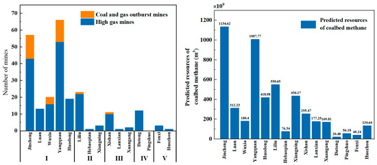 In order to more intuitively demonstrate the distribution characteristics of methane in different coal mines and predict the resource reserves, investigations were conducted on the types, quantities, and predicted methane emissions in five different mining areas. The results are shown in Figure 2. The high-gas zone of the Qingshui Basin (I) includes the Qingshui Coalfield, where the coal seam has a high methane content. The number of high-gas or coal and gas outburst mines is significantly higher than in other zones, and the abundance of methane reserves is highest. The high-gas zone of the Hedong Coalfield (II) includes the Hedong Coalfield area, where the coal seam thickness is greater, and the methane content is higher. The number of high-gas mines is significantly higher than in the Xuangang Xishan high-gas zone (III), Northern Shanxi uplift methane zone (IV), and Fenwei rift methane zone (V), and the abundance of methane reserves is second highest. The Xuangang Xishan high-gas zone (III) includes the Xishan Coalfield, where the coal seams are shallow or low-grade, and the abundance of methane reserves is moderate. The Northern Shanxi uplift methane zone (IV) includes the Datong Coalfield and part of the Ningwu Coalfield. The number of high-gas or coal and gas outburst mines is similar to that in the Xuangang Xishan high-gas zone (III), but the reserves are lower due to the shallow burial depth of the coal seams and low coal grade. The Fenwei rift methane zone (V) includes the Huoxi Coalfield, which has the fewest high-gas mines and lower regional methane pressure. Due to the development of extensional structures, a large amount of methane in the coal seams has escaped, resulting in the lowest abundance of methane reserves.