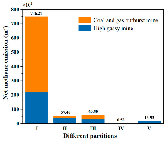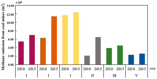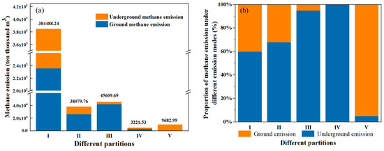 According to different criteria, methane emissions were calculated in different regions, and the main sources of methane emissions varied in different regions. Figure 3 shows that in Regions I, II, III, and IV, methane extraction is mainly from surface pumping, while in Region V, methane extraction is mainly from underground pumping. During the data aggregation process, it was found that the amount of methane extraction varies significantly for the same mine under different pumping modes. In contrast, the total methane extraction remains relatively stable. The size of methane emission from underground and surface pumping systems in different mines is related to the choice of pumping mode mentioned above. The total methane emission is not directly related to the choice of pumping mode. The emission varies with the change in extraction volume and methane extraction efficiency. The methane extraction volume of each mine is determined based on the methane concentration in the mine air to ensure safe coal production.
