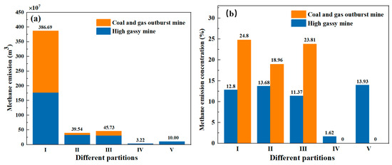 Figure 4. (a) Emission and (b) concentration of methane drainage in different grades of gas mines.