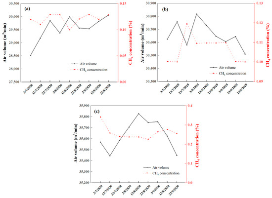 Figure 7. Air volume and CH4 concentration in (a) ventilation shaft a, (b) ventilation shaft b and (c) ventilation shaft c in coal mine A.
