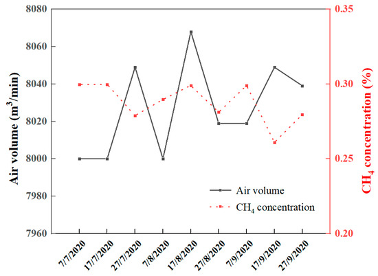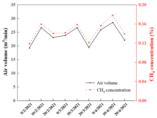 Figure 10. Air volume and CH4 concentration in ventilation shaft in coal mine G.
