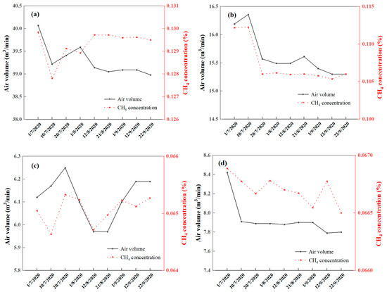 Figure 9. Air volume and CH4 concentration in (a) ventilation shaft a, (b) ventilation shaft b, (c) ventilation shaft c and (d) ventilation shaft d in coal mine C.