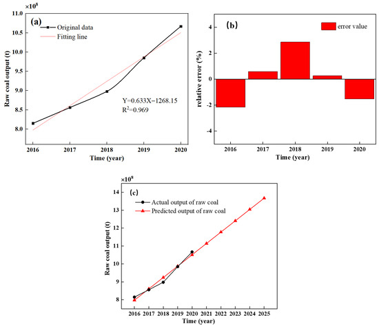 Figure 11. (a) Fitting diagram, (b) error diagram and (c) prediction diagram of raw coal output.
