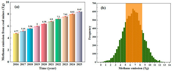 The Monte Carlo method is used to study the effects of uncertainty in coal mine methane emission. This is a method that uses statistical sampling theory to approximate the solution of a mathematical problem. The basic steps of the Monte Carlo method include selecting the input parameters for the uncertainty analysis, determining the probability distributions and ranges of the input parameters, and generating the probability distributions of the model output values. In this study, we used the Oracle Crystal Ball program to analyze the uncertainty of emissions. The input parameters were the values of the modified emission factor model GM (1,1) and the values of the coal mine production in Shanxi Province. The methane emission factor took the values of 8.85–9.14 m3/t and a median of 8.99 m3/t. The model was set up to simulate the running of 10,000 experiments according to the probability distribution for each parameter.
