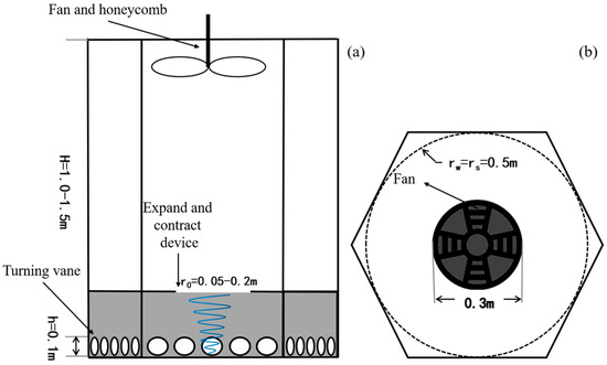 Diagram of the tornado simulator: (a) front view; (b) top view.