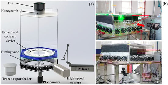 The experimental platform in this study is shown in Figure 2a, and the measurement techniques mainly include particle image velocimetry (PIV) and high-speed camera. The high-speed camera used in this experiment was the Revealer 5F01, which was based on the CMOS image sensor and can achieve a frame rate of 2000 fps at full-frame resolution (1280 × 1024 dpi). And, the two-dimensional PIV measurement system produced by TSI was employed to provide full flow-field-velocity information. Moreover, the glycol solution was atomized by an ultrasonic atomizer to produce droplets of uniform concentration and size to provide tracer particles for PIV systems. These particles were sufficiently small to follow the fluid motion accurately and not alter the fluid properties or flow characteristics. Figure 2b demonstrates the PIV system components as well as the test setup. The horizontal velocity field (radial and tangential components) were measured at the center of the simulator and at 25 cm heights above the ground. The red arrows indicate the camera’s viewing perspective.