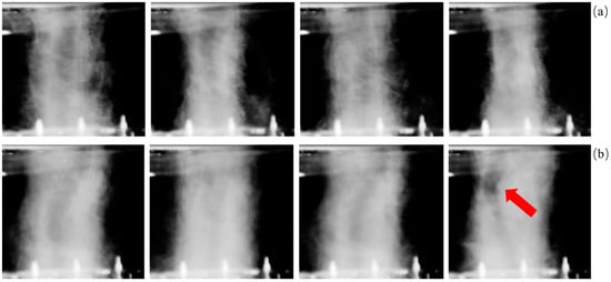 The primary objective of the validation work was to ensure that the velocity field generated by the tornado simulator matched that of an actual tornado. Figure 3 displays flow images captured by a high-speed camera at different swirl ratios and time instants, with a temporal resolution of 13 ms. Panels (a) and (b) in Figure 3 correspond to swirl ratios of 0.13 and 0.43 for t = 1ms, t = 14 ms, t = 27 ms, and t = 40 ms, from left to right. The tornado-like vortex structure exhibited an overall columnar shape extending from the ground to the updraft orifice, with minimal variation in vortex core size with height observed in both cases. At a swirl ratio S = 0.43 (Figure 3b), the vortex diameter was larger, and the distortion of the vortex core was more pronounced. As labeled by the arrows in the figure, the vortex exhibited evident bending and deformation. These observations were attributed to the adverse axial pressure gradient [33] and the wandering effect [34]. Overall, the captured flow patterns demonstrated remarkable agreement with previously simulated vortices in tornado vortex chambers [21,25] and real tornadoes [30].