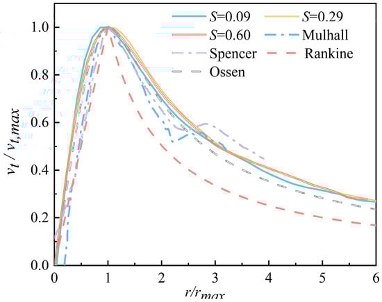 In addition, the normalized tangential velocity along the radial direction was compared with the Spencer and Mulhall tornados [10,11], as well as Rankine and Oseen vortex theoretical models [35,36]. As can be seen from Figure 4, the tangential velocities at different swirl ratios exhibited a typical pattern of increasing and then decreasing from the center outward, which was in good agreement with the measured data and the theoretical model, demonstrating the reliability of this simulator. In addition, the data for the Rankine vortex were slightly inconsistent because they did not consider viscous effects such as vortex diffusion and energy dissipation.