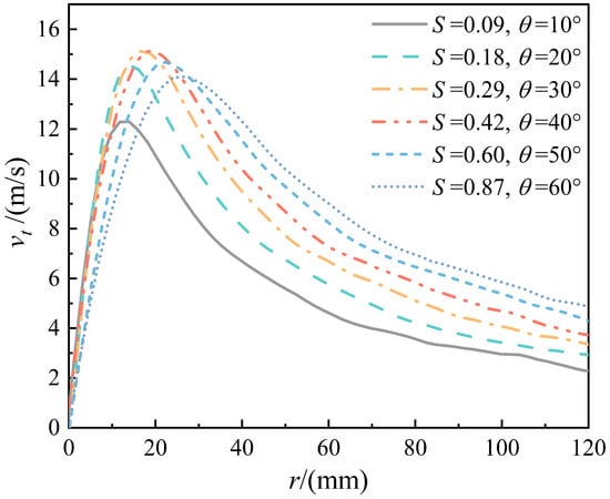Figure 5 displays the instantaneous streamlines superimposed on the horizontal velocity contours of group 1. As shown, the vortices observed at different swirl ratios are all counterclockwise rotating single-celled vortexes. With θ from 10° (a) to 60° (d), vortex radius and velocity are increased; this is because S can stabilize the vortex structure in this range. However, as θ continues to increase, the vortex radius increases, and the velocity decreases. The average tangential velocity and vortex radius are shown in Figure 6 to illustrate the phenomenon more clearly. The reason is the effect of vortex breakdown, high swirling velocities and pressure deficit which create a vertical pressure gradient that causes downward flow, further causing the vortex radius to increase and velocity to decrease. At this time, the vortex is in a critical state and no dual-celled vortex has been observed.