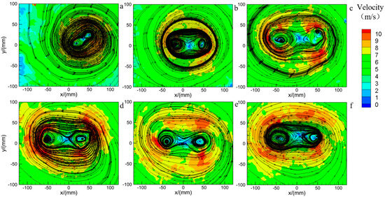 Figure 7 and Figure 8 show the results of group 2 and group 3. As can be observed in Figure 7 (5 cm), S reaches 0.43 when θ was 30°, there are two secondary vortices rotating around the central axis, and the area of the vortex core evolution to elliptical, which is a typical dual-celled vortex (Figure 7c). However, in Figure 8 (0 cm), the vortex structure is transformed into a dual-celled vortex when S is only 0.18 and θ is 10°.
