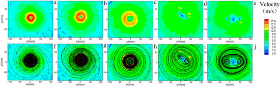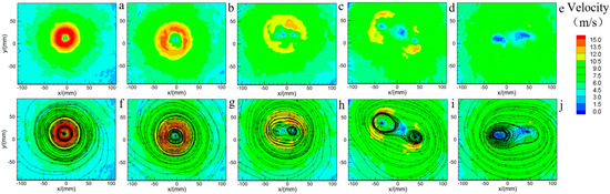 Instantaneous horizontal velocity contours and streamlines of group 6: (a) = 10 cm; (b) = 12.5 cm; (c) = 15 cm; (d) = 17.5 cm; (e) = 20 cm; (f) = 10 cm; (g) = 12.5 cm; (h) = 15 cm; (i) = 17.5 cm; (j) = 20 cm.