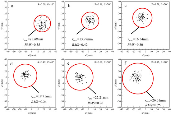 Instantaneous vortex core distribution and average vortex radius of group 1: (a) θ = 10°; (b) θ = 20°; (c) θ = 30°; (d) θ = 40°; (e) θ = 50°; (f) θ = 60°.