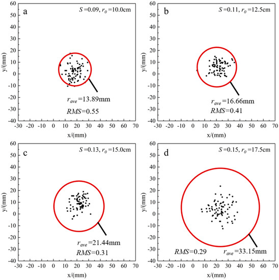 In addition, the phenomenon of vortex wandering in group 1 and group 4 is investigated. Wandering is defined as a random movement of the tornado-like vortex from its time-averaged position and, therefore, can influence vortex characteristics such as time-averaged velocities and core size. Here, the vortex-center locations in the horizontal planes when the flow field is single-celled are tracked as Figure 12 and Figure 13, and 80 data are recorded in each image. The black dot is the instantaneous vortex center, and the red circle is the average vortex radius.
