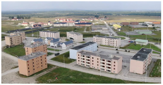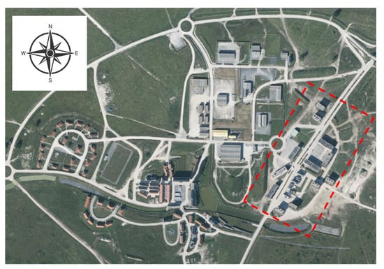 We can distinguish four zones in the site: residential, city center, industrial, and modern. The experiments were carried out in the latter one, which is presented in Figure 2. This zone is where the tallest buildings are located. Their height ranges from 7 to 17 m.