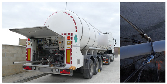 The releases were made directly from a truck. To do so, a release device was connected to the filling line of the truck as shown in Figure 3. It consisted of a 1.5 m long and 2-inch diameter pipe. It was directed horizontally at a height of 1 m. It is worth noting that after preliminary experiments, cables were added to help stabilize the system and avoid vibrations.