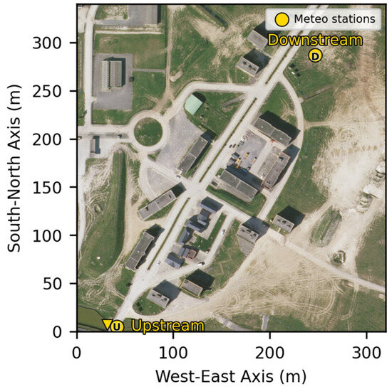 To ensure that the wind field maintained a preferential direction over the entire test area, two weather masts were positioned, one upstream of the discharge point and the other downstream. The positions of the two weather masts used for the experiments are presented in Figure 4.