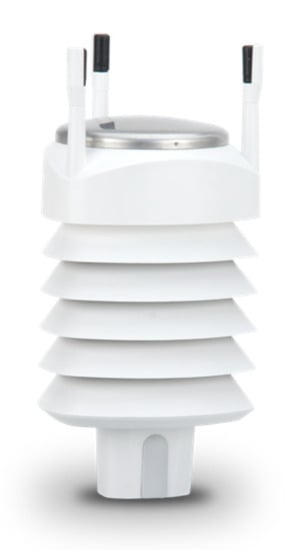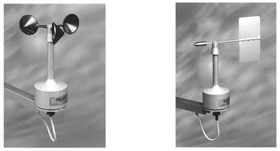 The downstream station sensor (Figure 6) uses mechanical technology. It is a device consisting of a wind vane and an anemometer to measure the direction and speed of the wind, respectively. The vertical component of the velocity is not measured. The acquisition frequency is 1 Hz. The accuracy of the measurement is ±2.8° for the wind direction and ±0.17 m/s for the wind speed.