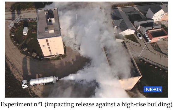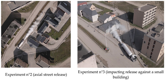 Three CO2 releases were performed the same day with one truckload in three different configurations: one axial street release (experiment n°2) and two impacting releases (against a small (experiment n°3) and high-rise building (experiment n°1)). These configurations are presented in Figure 7.