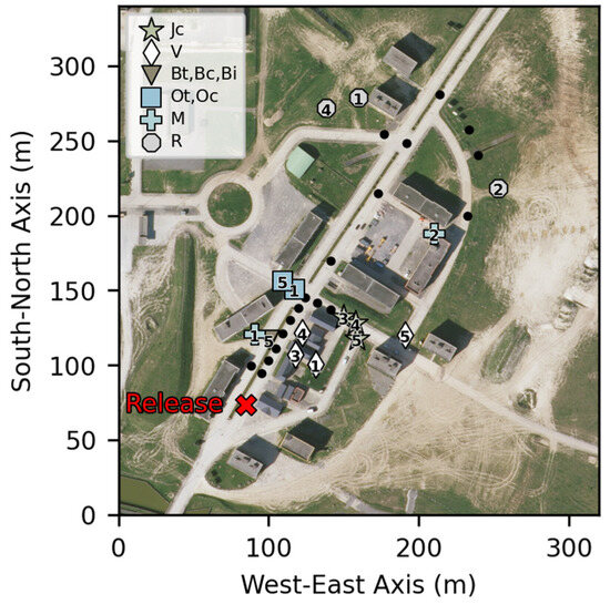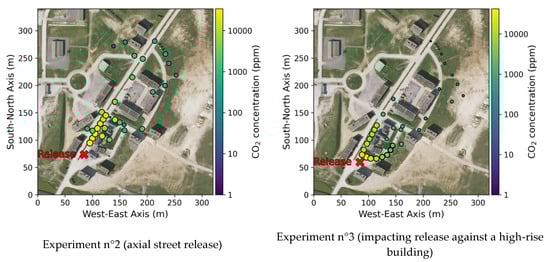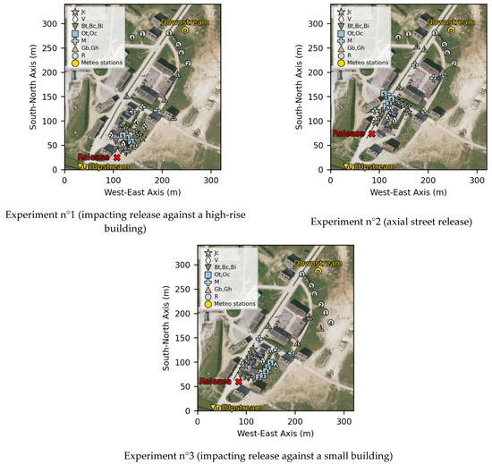 Depending on the experiment configuration, the sensors were positioned in places of strategic interest. For experiments 1 and 3, sensors were placed in front of the impacted building and behind or on the side of it to measure the impact of recirculation on gas concentration. Sensors were positioned in cross streets or between buildings to assess the influence of the built environment on dispersion. In the far field, an arc of sensors was positioned to assess the influence of the experiment configuration beyond the building zone.