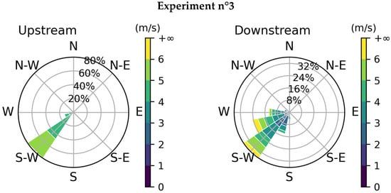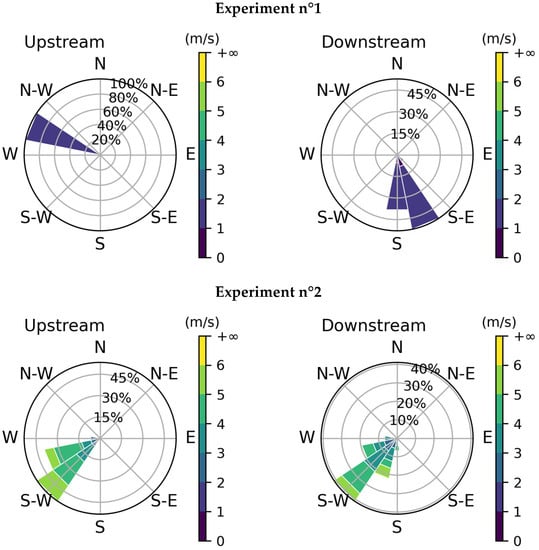 Two weather stations were used, one upstream and one downstream. The raw data collected from the stations include wind velocity and direction, temperature, and humidity. The acquisition rate was 1 s for the downstream station and 60 s for the upstream station. The wind changes obtained for both stations and during each experiment are shown in Figure 9 and the mean conditions are in Table 4. By convention, the wind direction indicates where it comes from; the 0° corresponds to the north, and the angle increases clockwise.