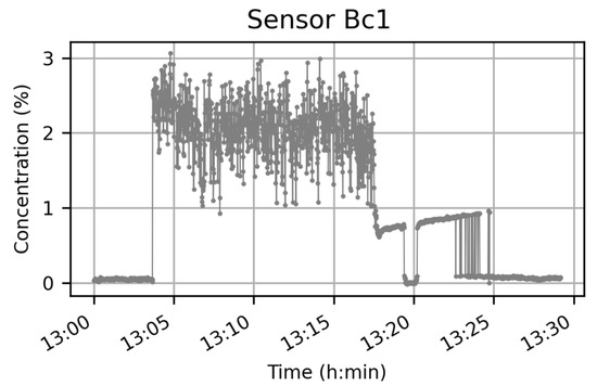 For each sensor technology, the data acquired were post-processed to obtain the evolution of concentration. The behavior was similar for each sensor and experiment. Before the cloud, there was a plateau that represented the background concentration of CO2 in the air. As the cloud passes the concentration fluctuates. After the discharge, the concentration returns to a level close to that prior to the discharge, except for some catharometers for which some saturation effects were observed (Figure 10).