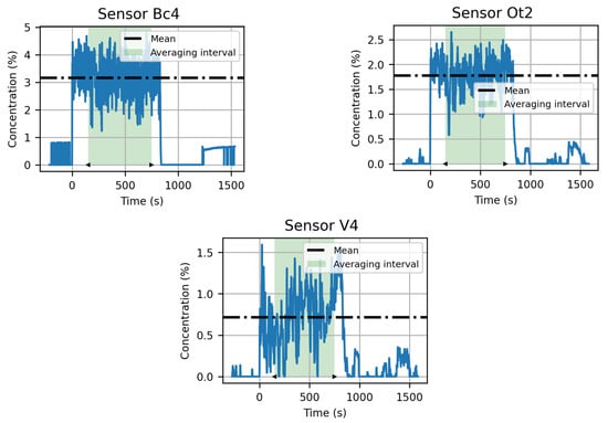 To find an average concentration for each sensor, the following method was used. We calculated the average concentration over a period of 10 min during the releases (which lasted approximately 15 min). This way, we ensured that the cloud was established at every measuring point and that the method was the same for all sensors. For the first experiment that lasted only 2 min, the duration was insufficient to carry out such a study. The method is illustrated in Figure 11.
