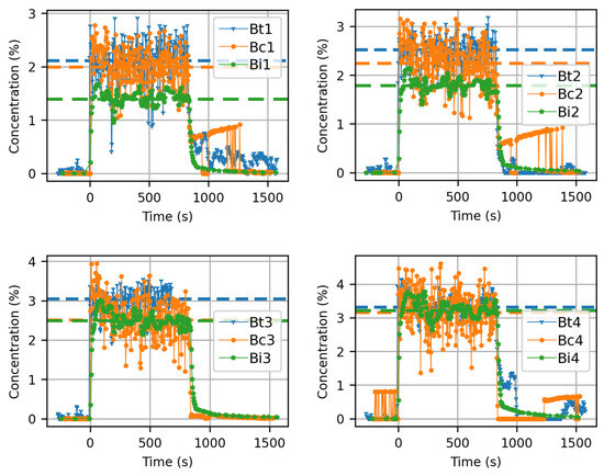 Figure 12 displays the treated data for the three sensor technologies located in four near-field positions for experiment 2. These three technologies were compared at the B position. As shown in Figure 8, sensors B1 to B4 were located very close to the source release and arranged, on its axis, in descending order (B4 was the closest to the release and B1 was the furthest away).
